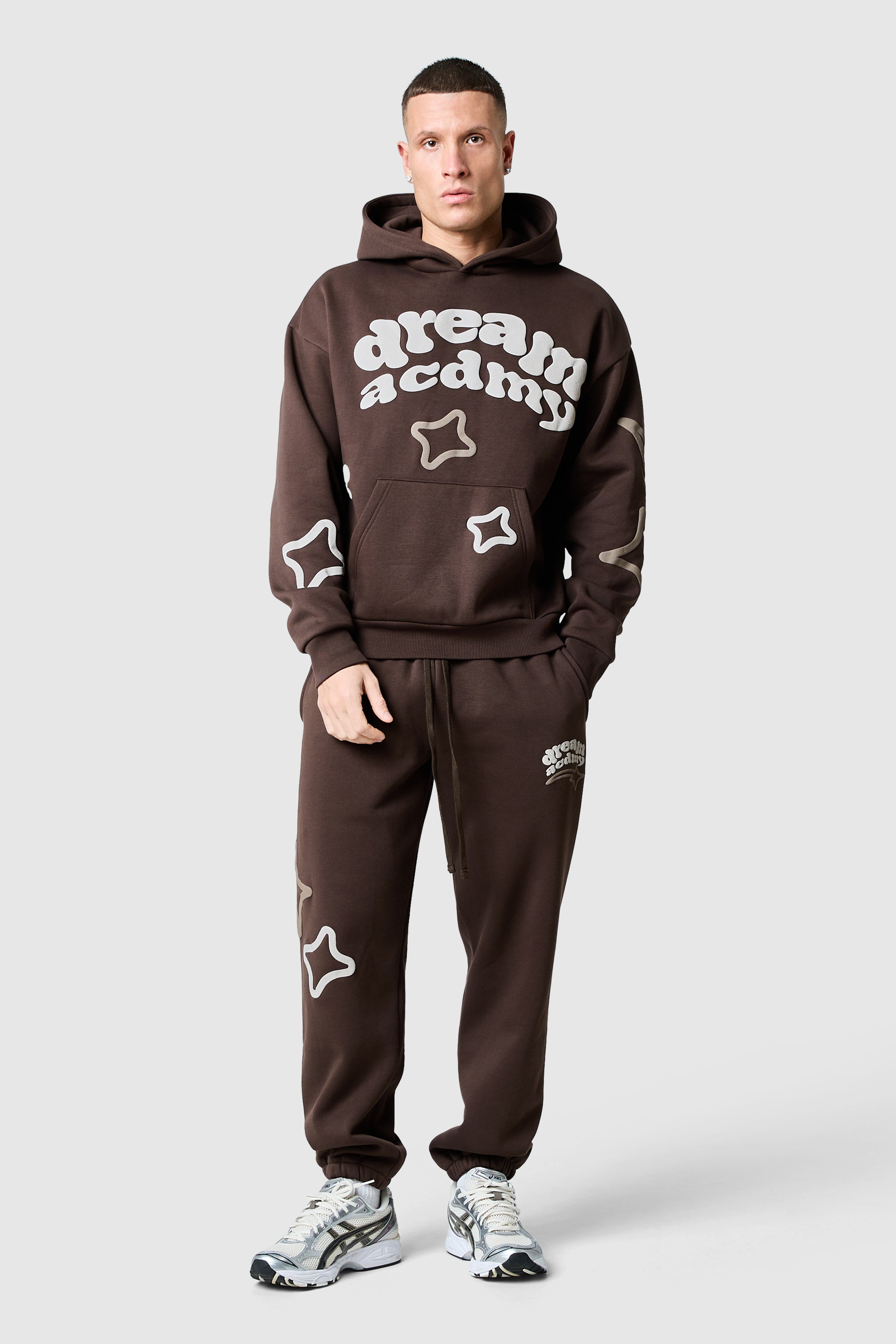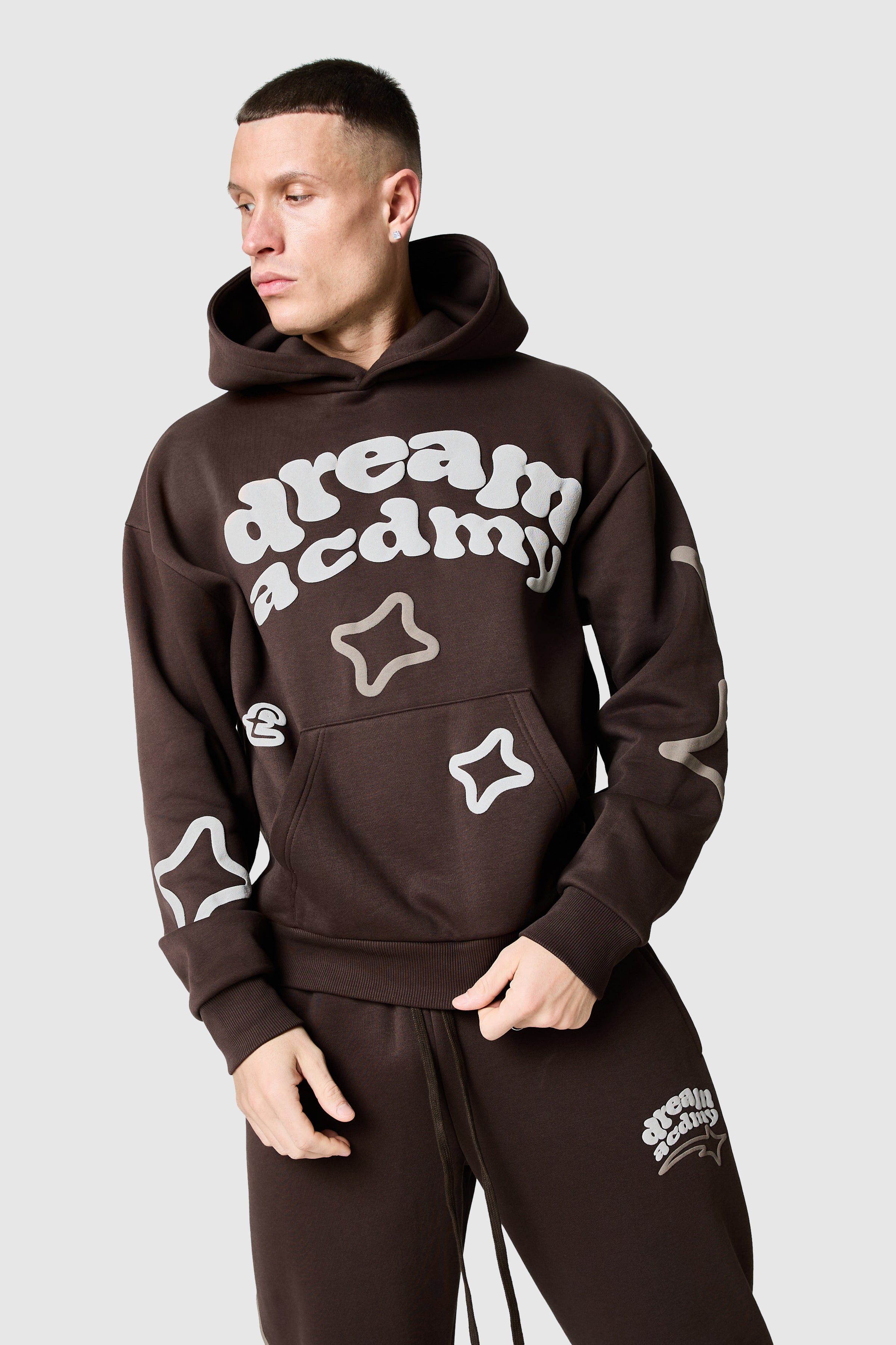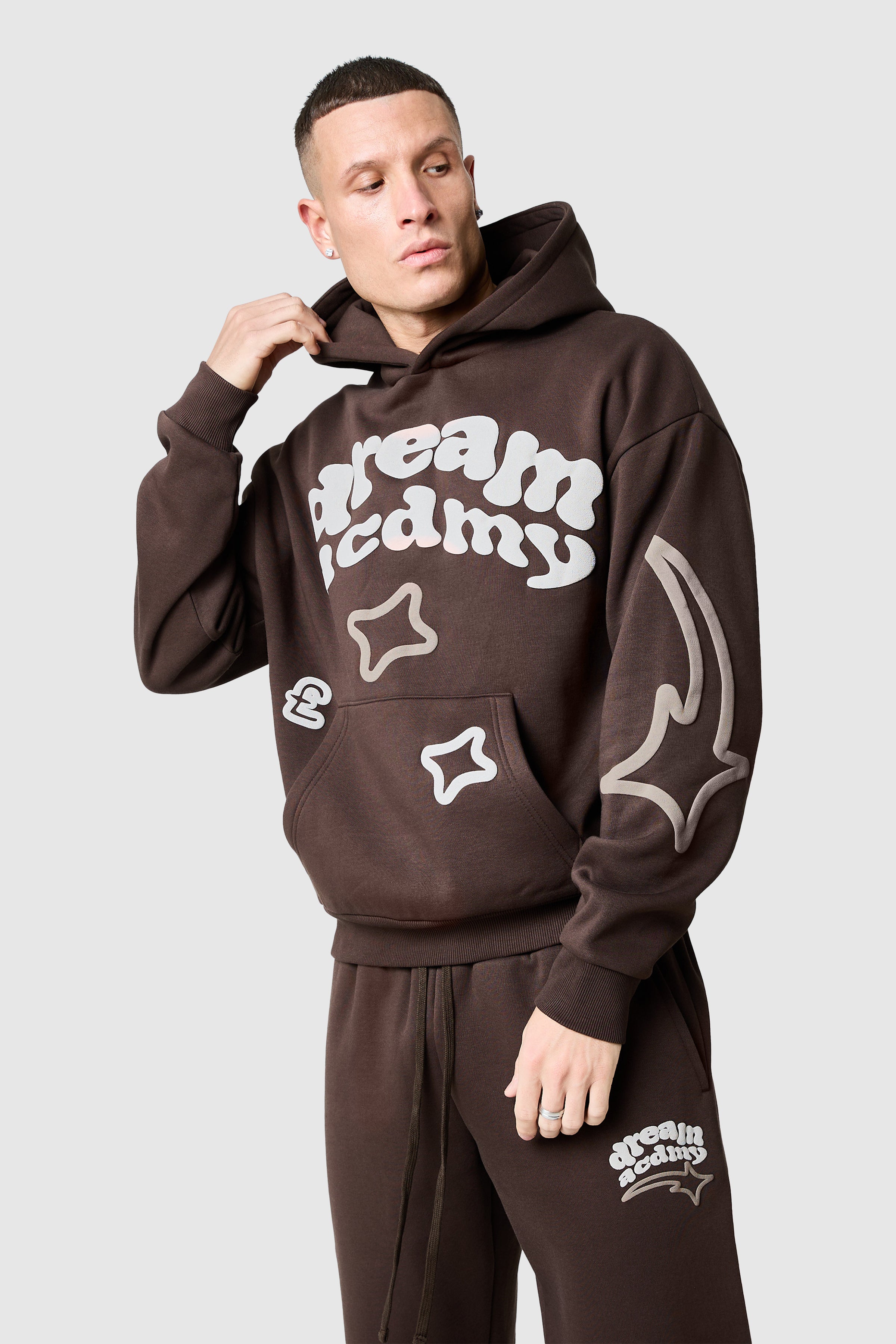 A relaxed hoodie designed for everyday comfort with bold graphic details. The Dream Acdmy Hood in Rich Brown is crafted from 80% cotton, 20% polyester brushback sweat (320 GSM) for a soft yet structured feel. Ribbed cuffs and tonal back neck tape ensure a secure fit, while puff print graphics on the front and sleeves create a modern, statement finish.