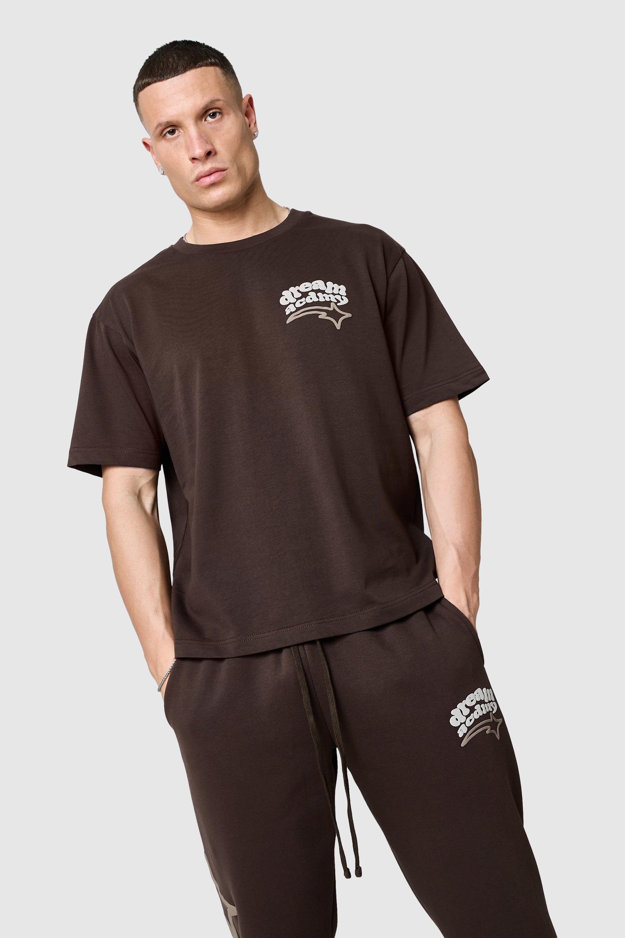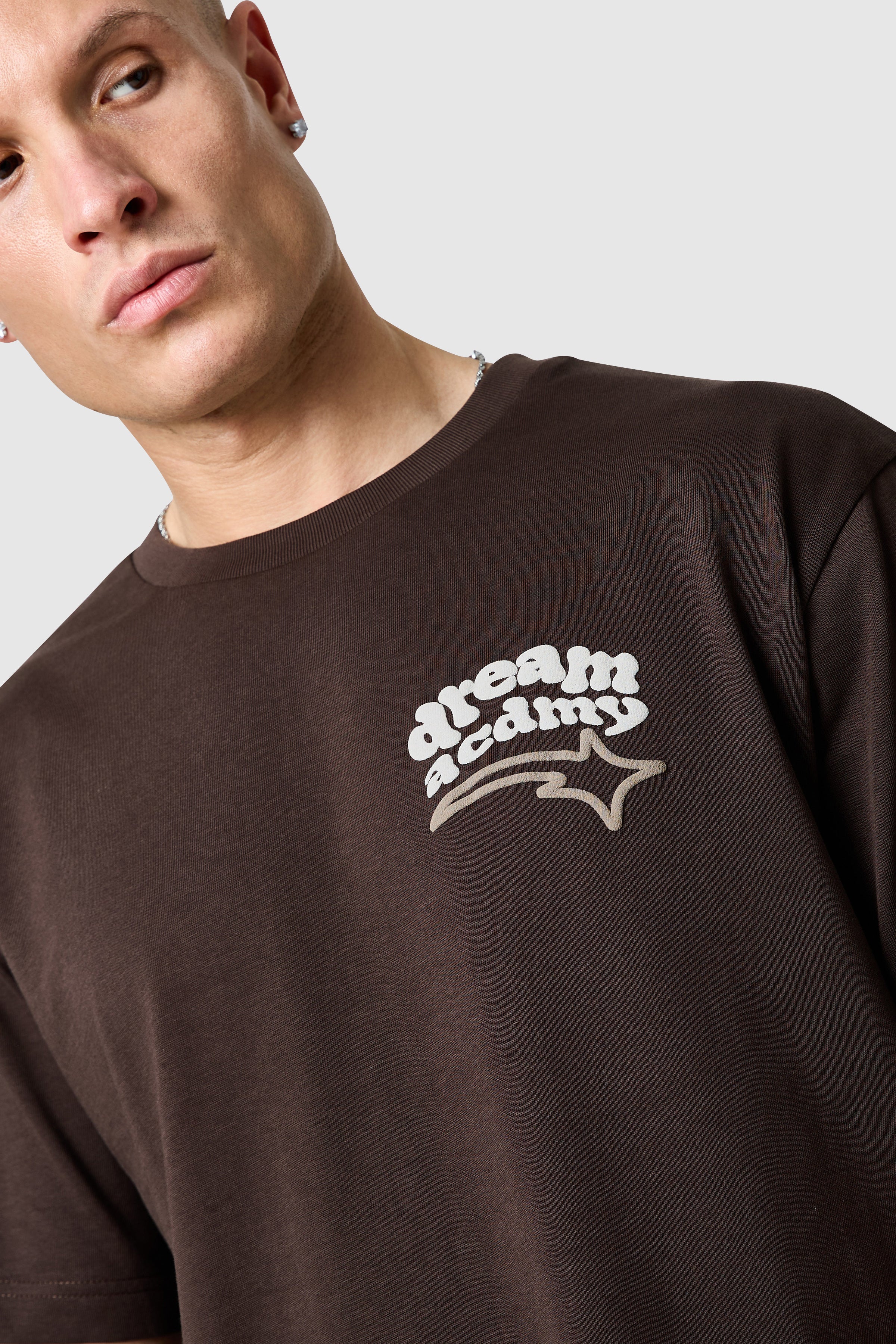 A classic cotton tee with bold, graphic detailing. The Dream Acdmy Tee in Rich Brown is crafted from 100% cotton jersey (240 GSM) for a comfortable, structured fit. Finished with tonal back neck tape and label, puff print graphics on the front and back deliver a modern, statement look.
