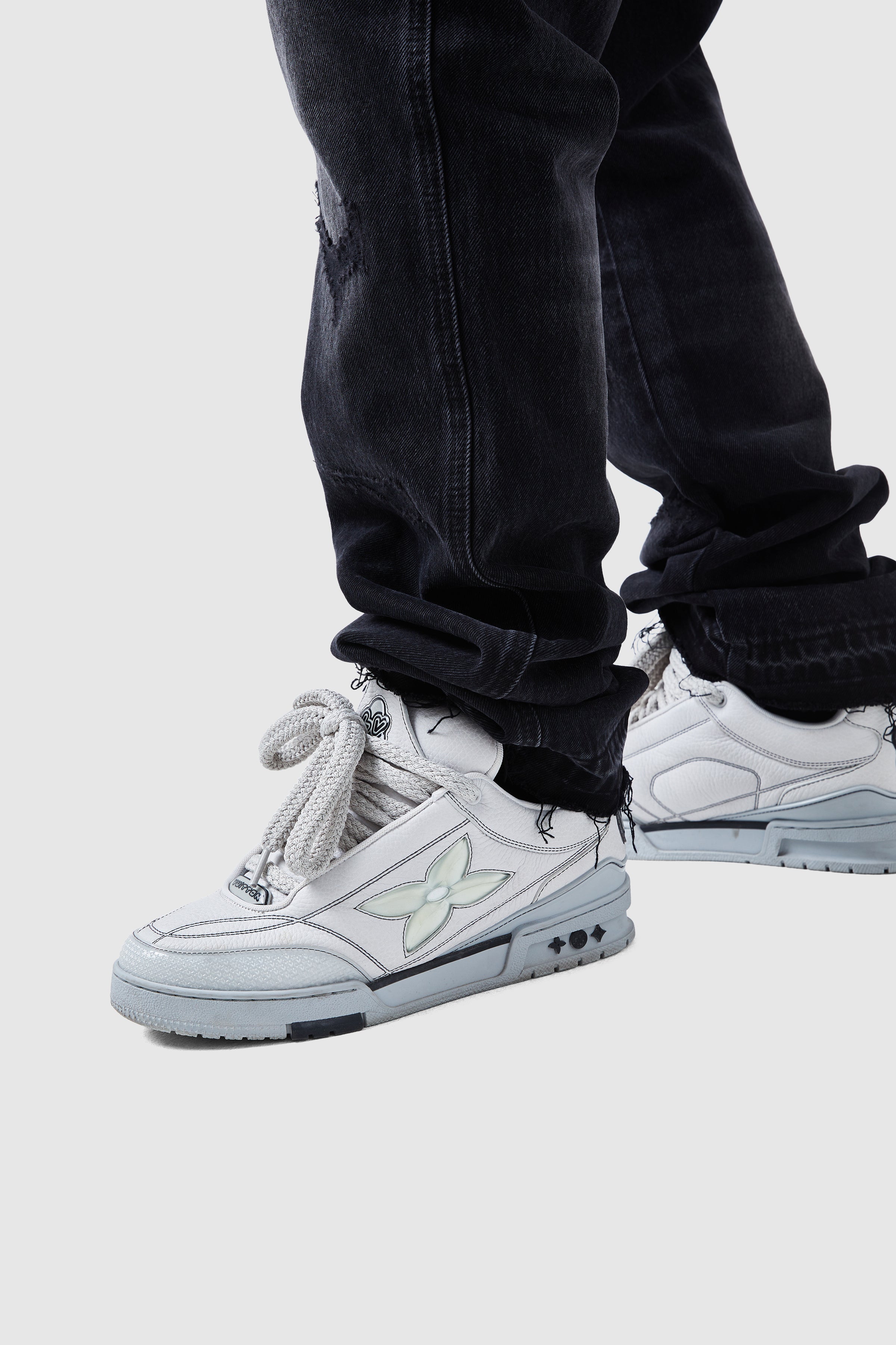 A stacked silhouette with a worn-in edge. The Elio Jean fits looser through the waist and thigh, tapering to an extended lower leg for a natural stacked finish.