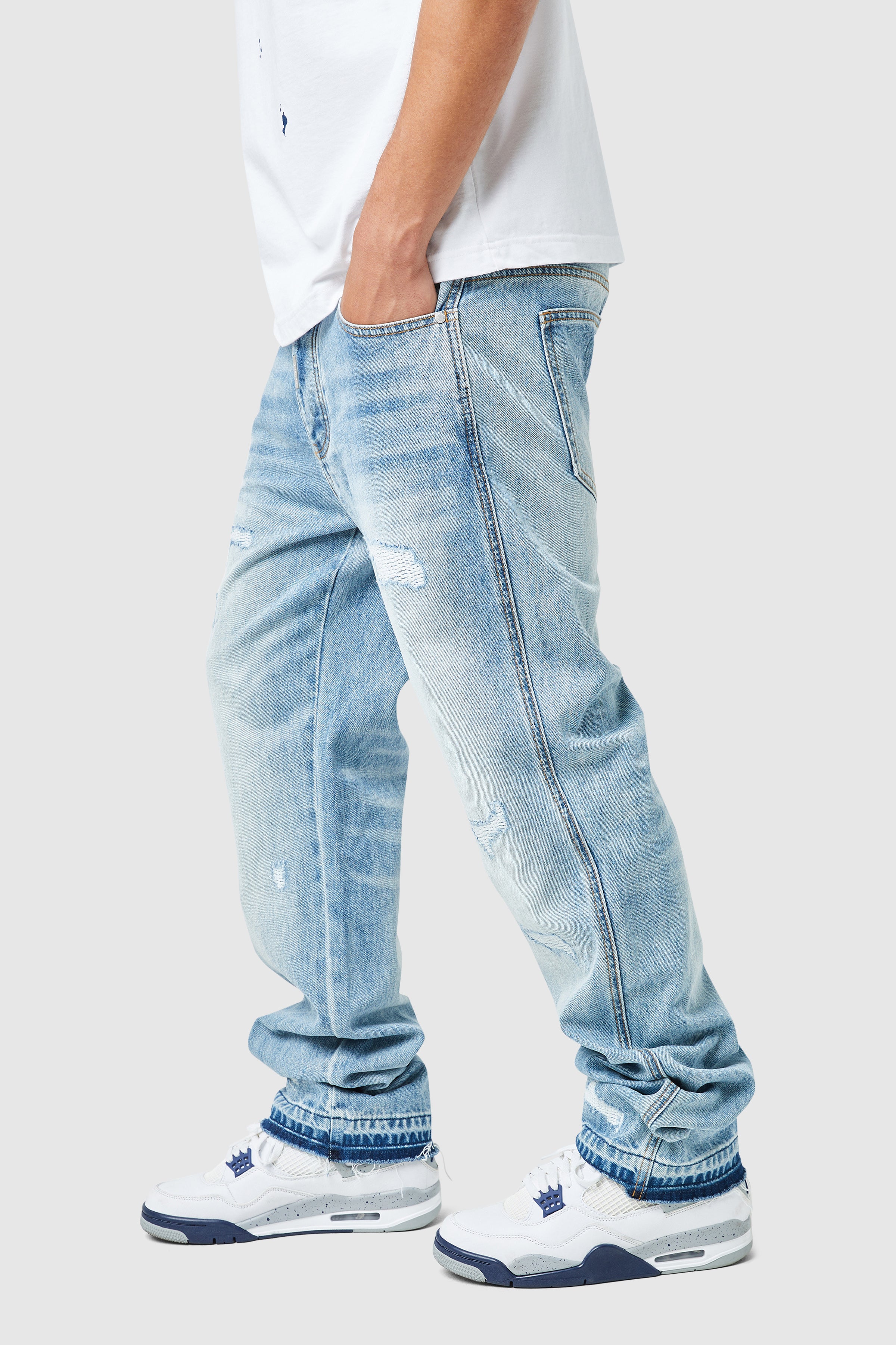 A stacked silhouette with a worn-in edge. The Elio Jean fits looser through the waist and thigh, tapering to an extended lower leg for a natural stacked finish.