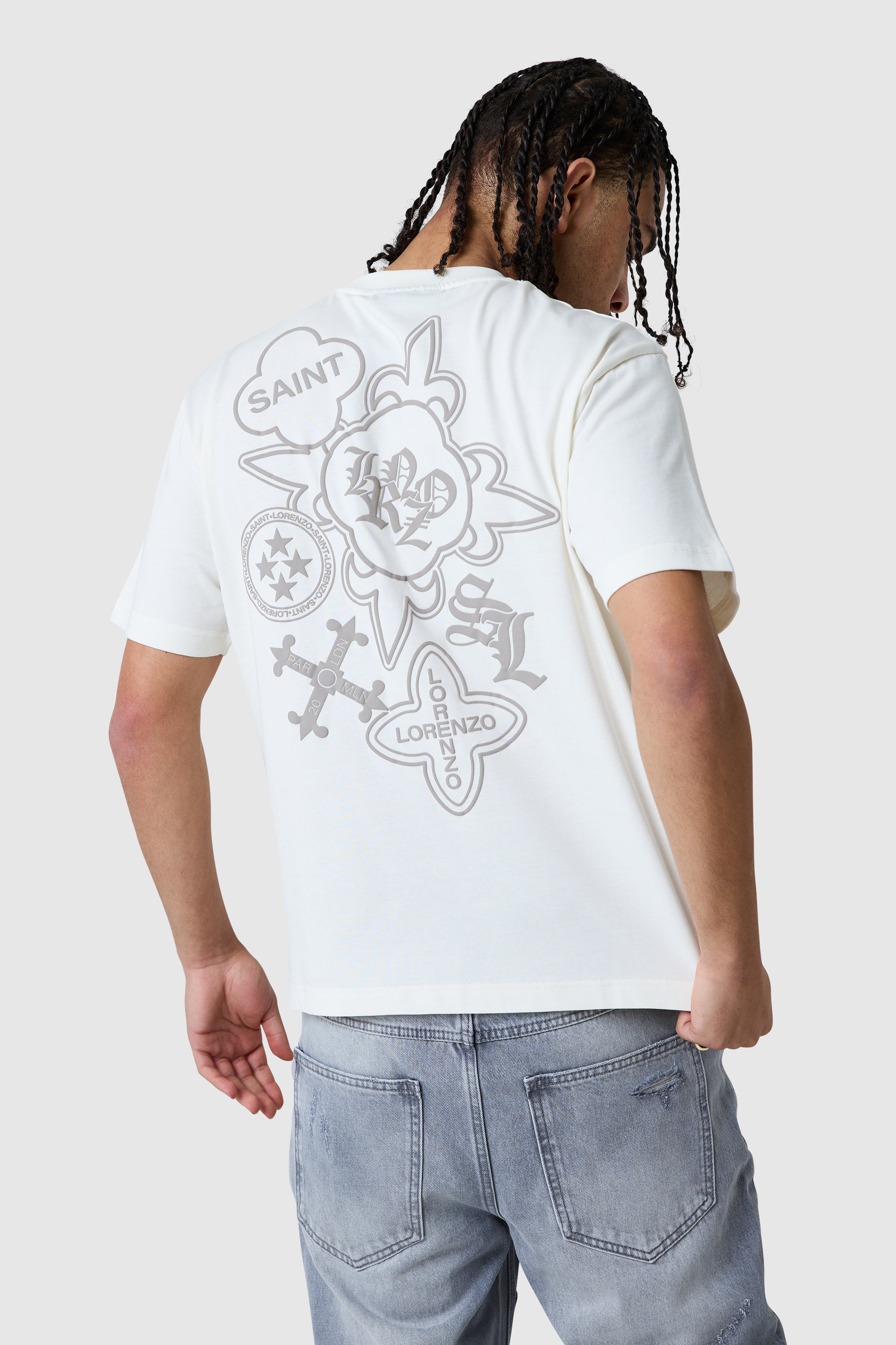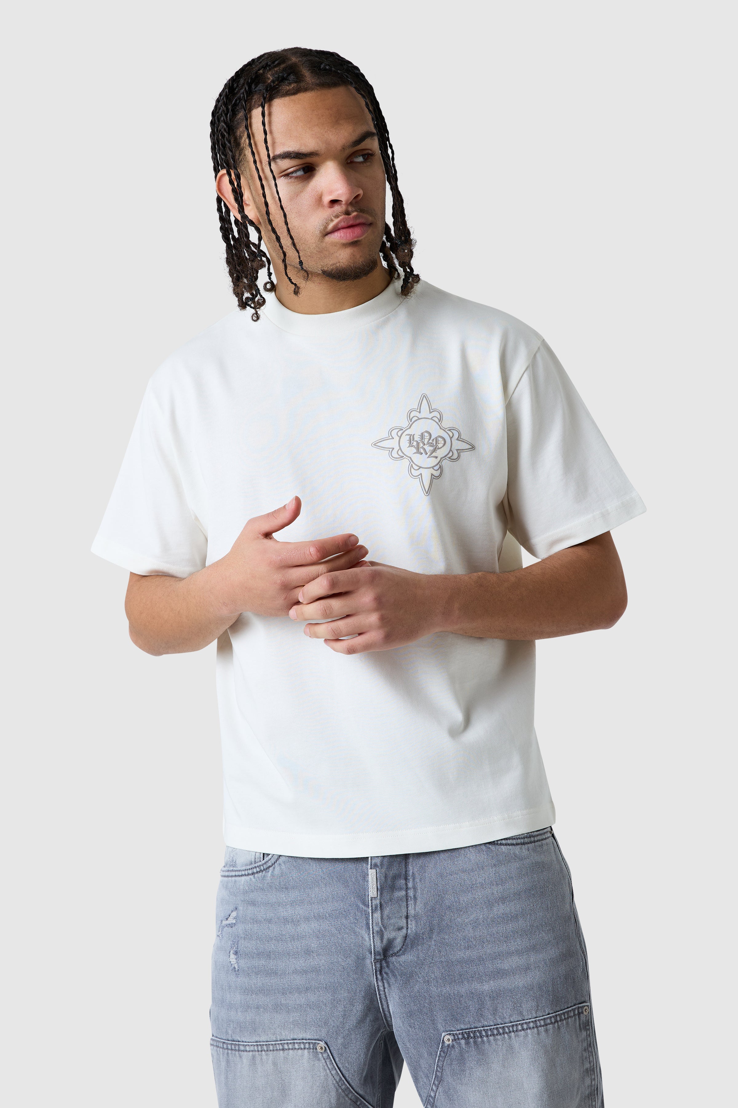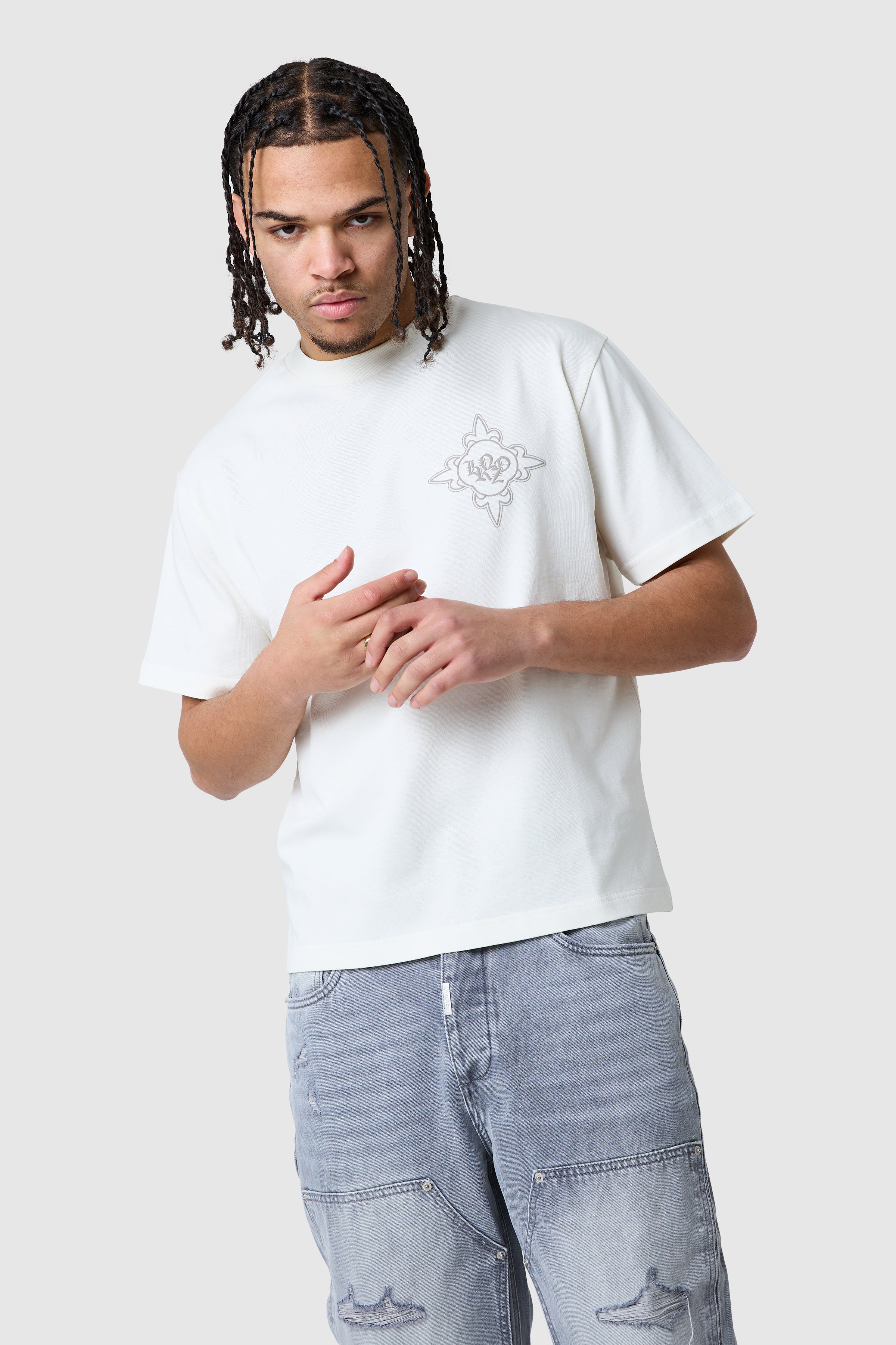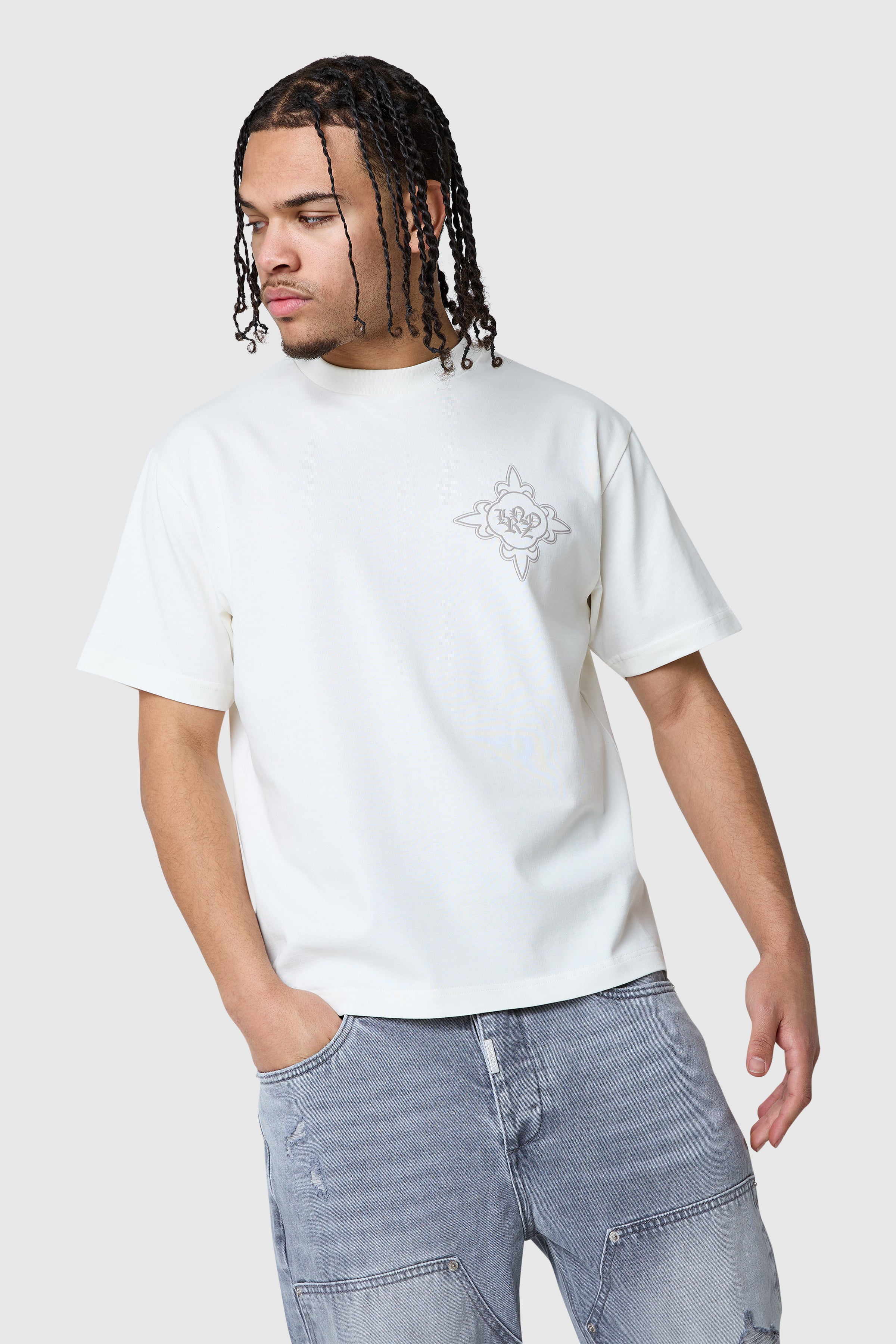 A core graphic tee designed for everyday wear with a bold edge. The Icon Core Tee in Off White is crafted from heavyweight 100% cotton for a substantial feel and structured fit. Finished with puff print graphics on the front and back, it delivers a strong visual statement while remaining easy to style.