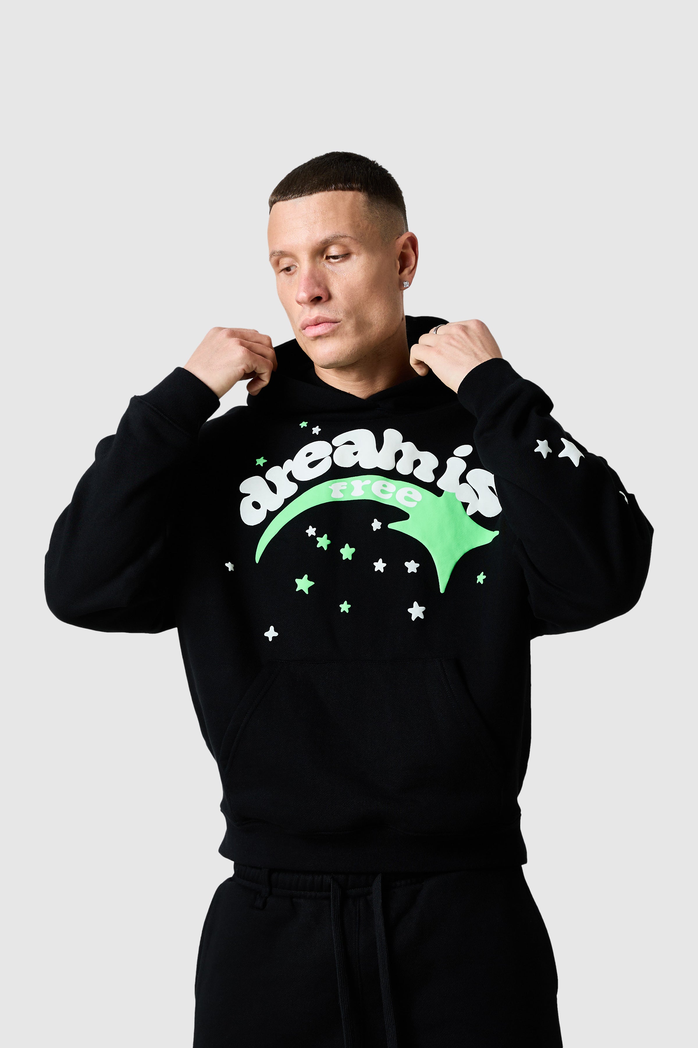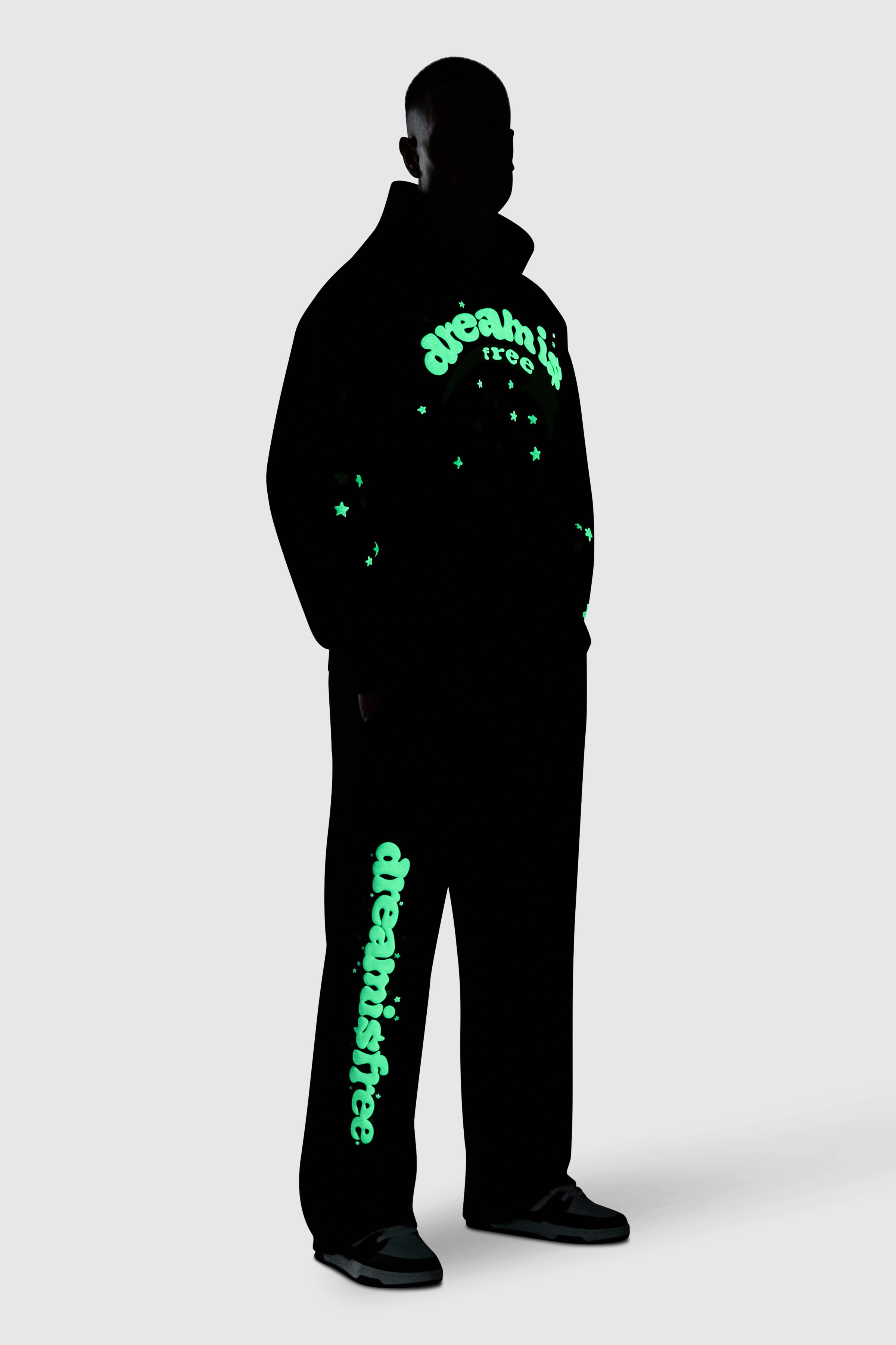 Designed for all-day comfort and bold expression, the Shooter Tracksuit features a relaxed hood and relaxed jogger silhouette. Statement, glow in the dark graphics create an easy, confident streetwear look. Style together or separately for everyday impact.