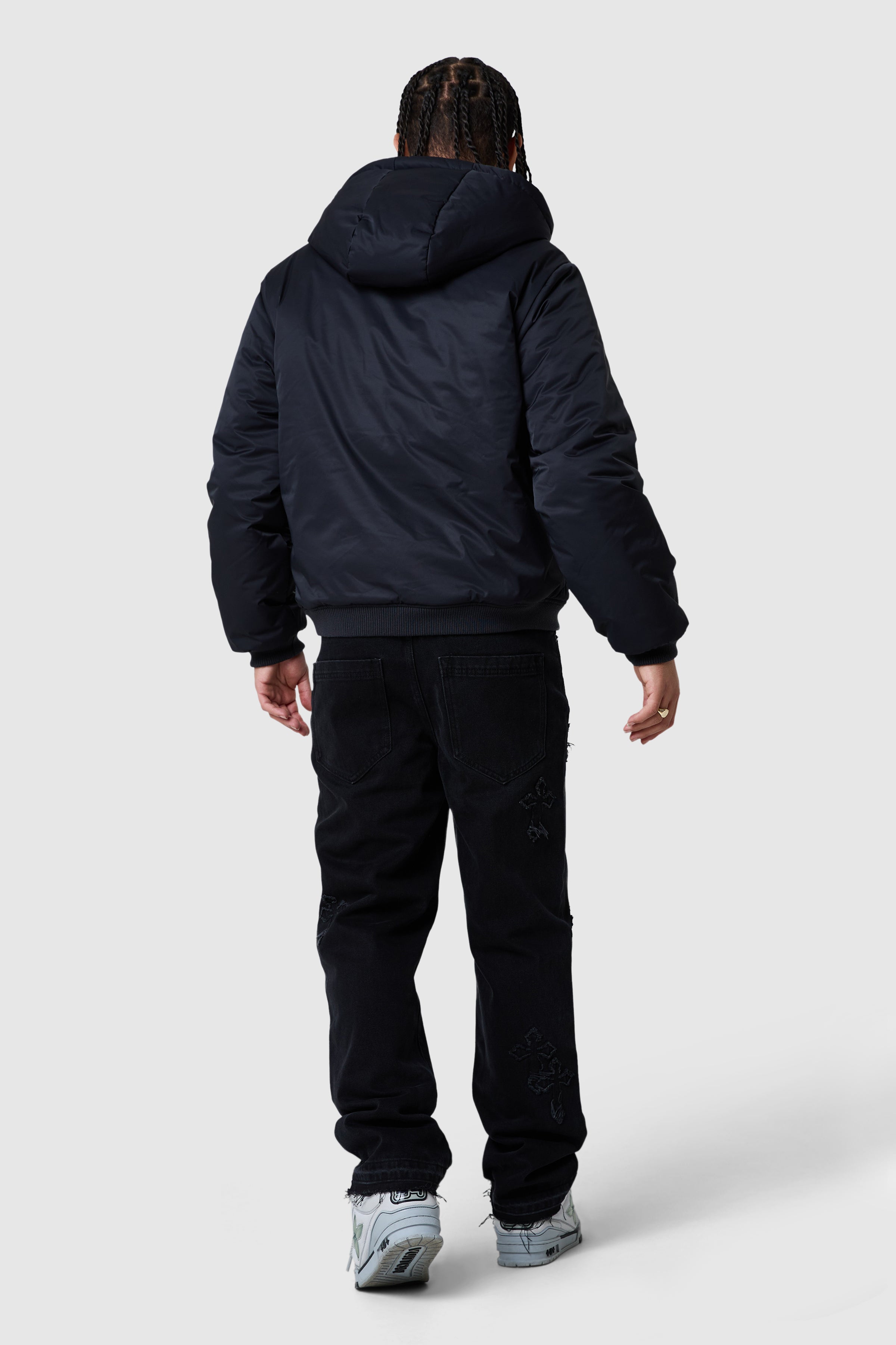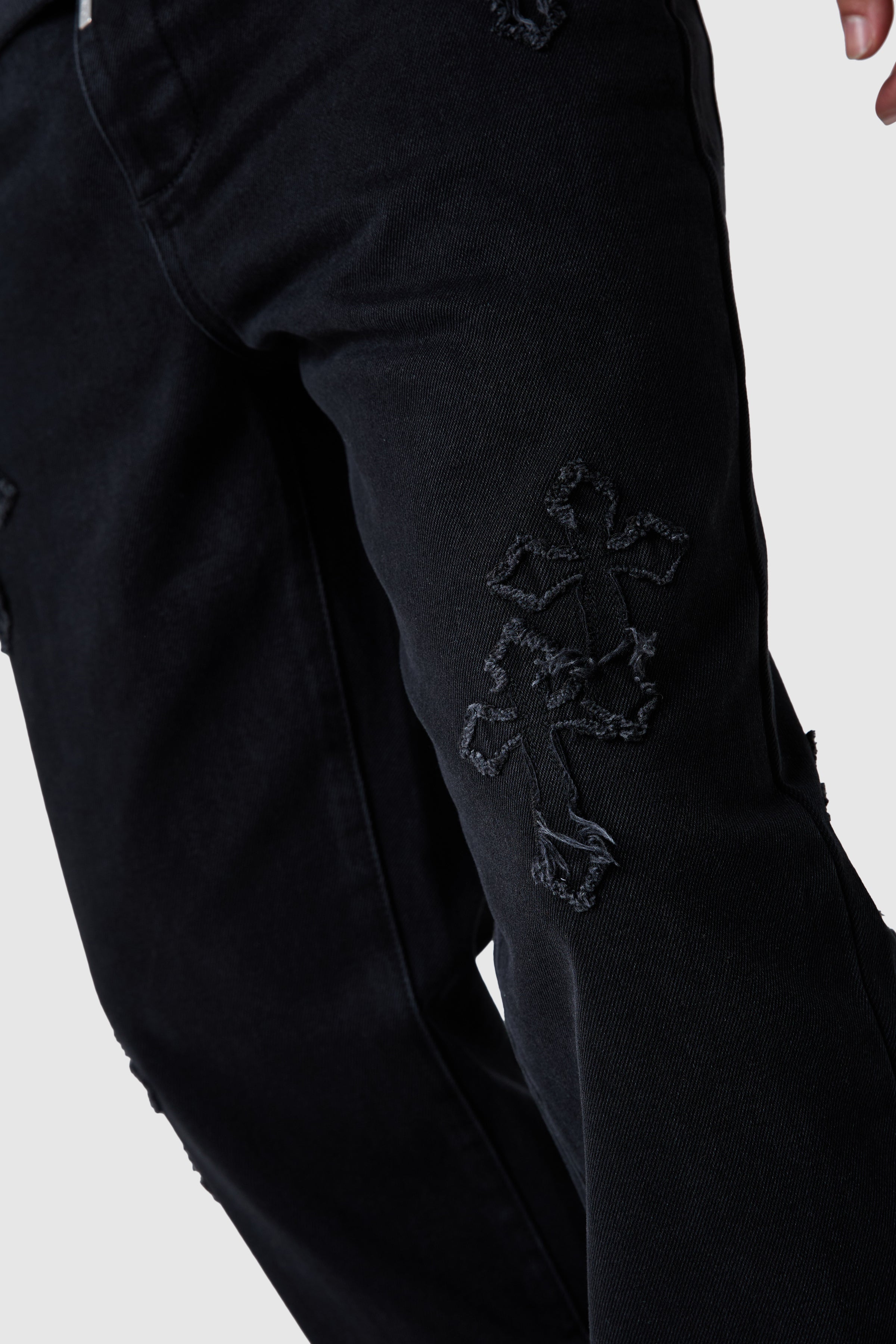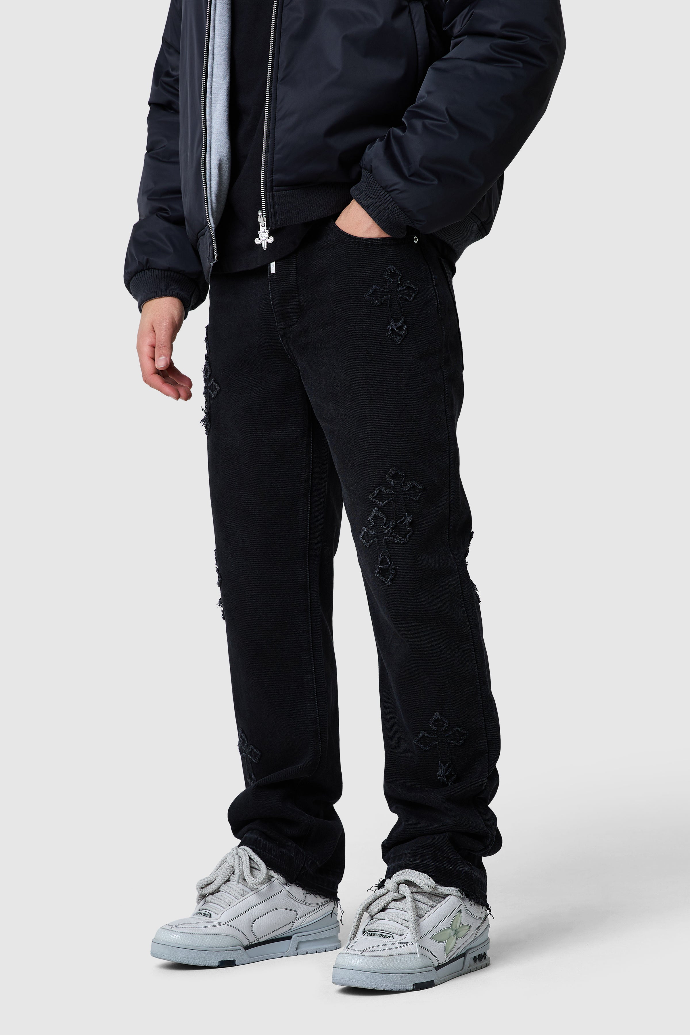 The Vince Jean in Black is crafted from a rigid base for a clean silhouette, finished with an open hem for a contemporary edge. Detailing of a cross self-fabric raw edge appliqué, adds depth and character to this elevated denim essential.