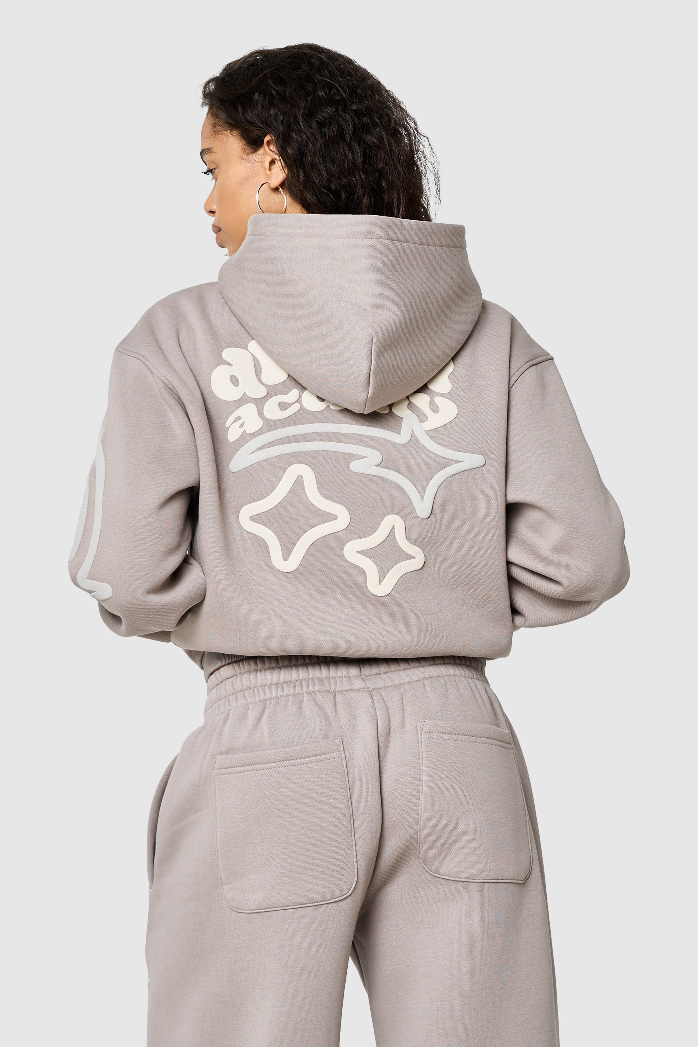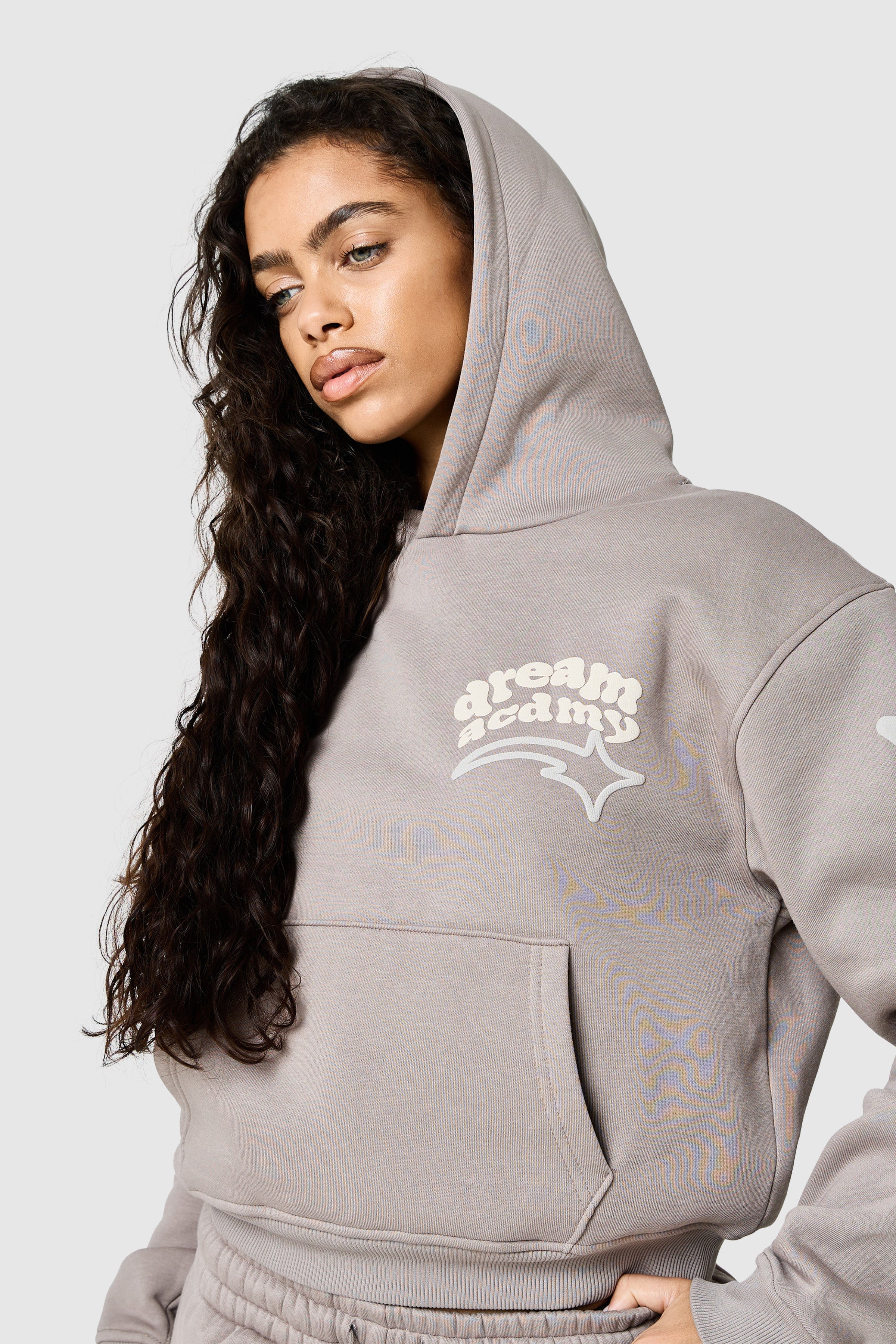 A relaxed hoodie designed for comfort with bold graphic detailing. The Soft Taupe Women’s Dream Acdmy Hood is crafted from 80% cotton, brushback sweat (320 GSM) for a soft, structured feel, featuring ribbed cuffs and hem for a secure fit. Puff print graphics on the front, sleeves, and back give a modern, statement finish.