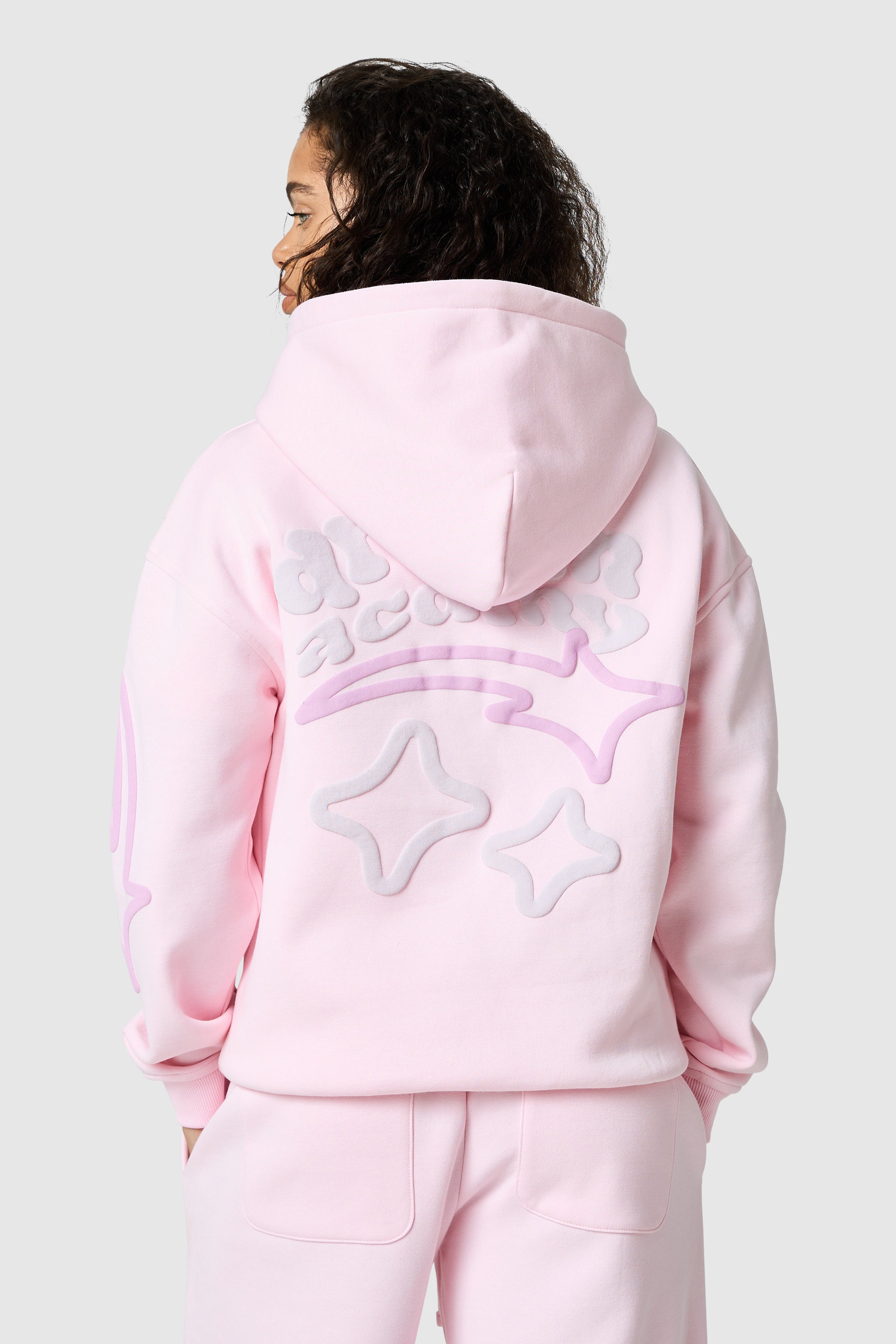 A relaxed hoodie designed for comfort with bold graphic detailing. The Candy Pink Women’s Dream Acdmy Hood is crafted from 80% cotton, brushback sweat (320 GSM) for a soft, structured feel, featuring ribbed cuffs and hem for a secure fit. Puff print graphics on the front, sleeves, and back give a modern, statement finish.