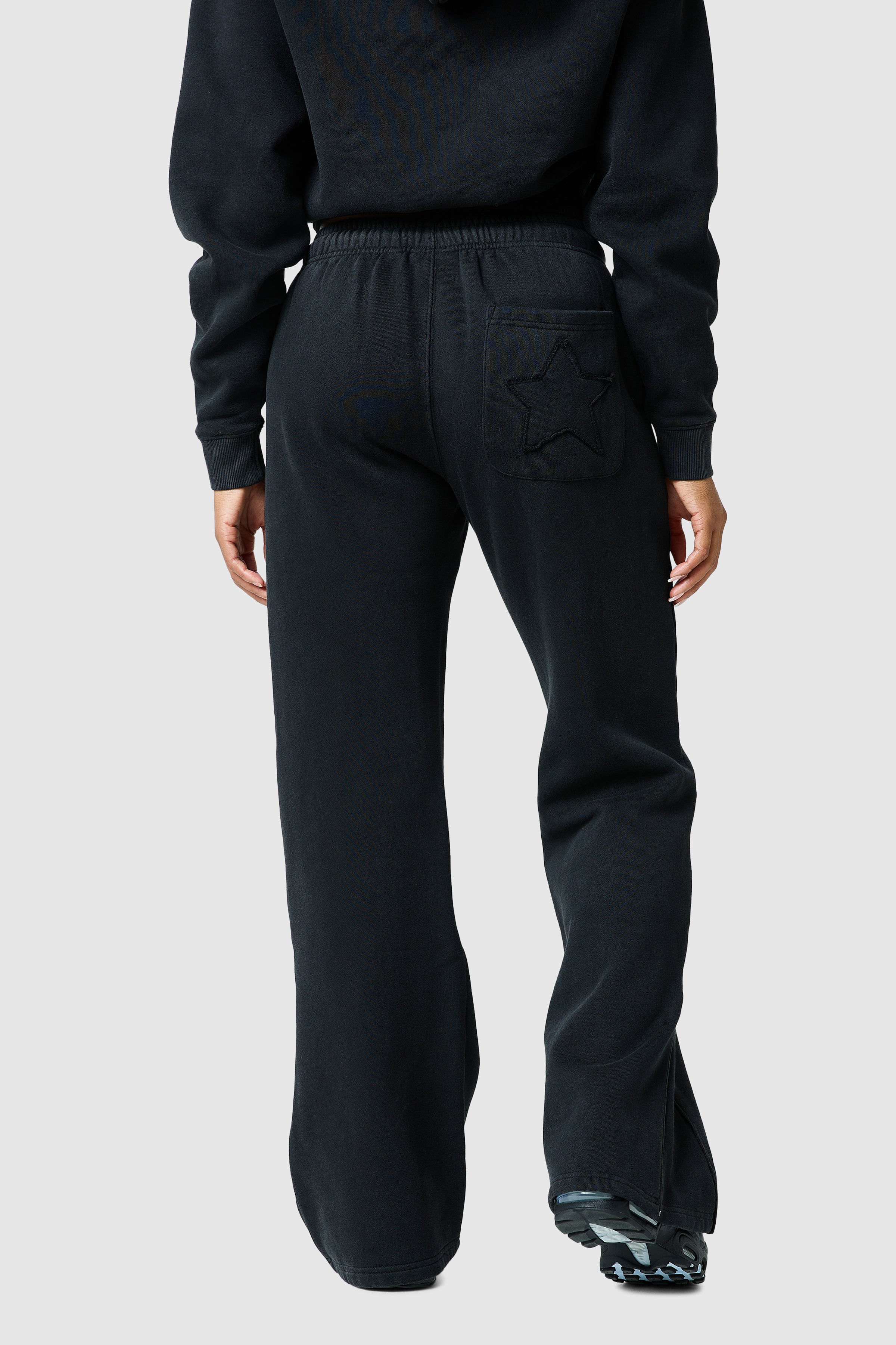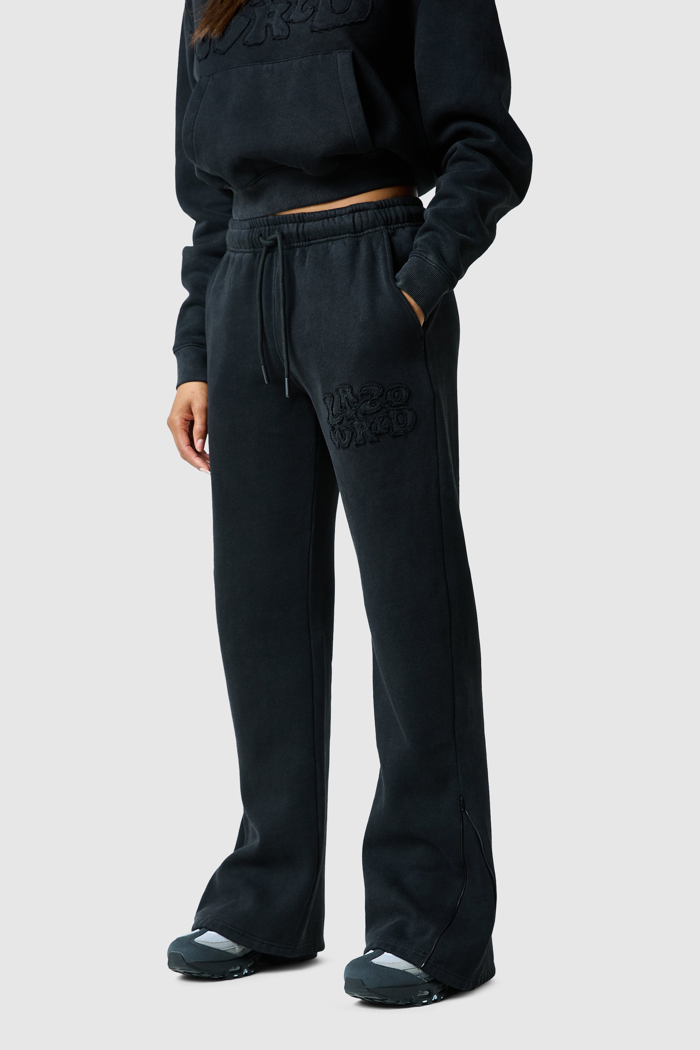The LRZO Wrld Black Applique Jogger - a statement set that blends comfort with street precision. The wide-leg joggers balance the look with a relaxed fit, drawstring waist, and matching applique detail. Clean, bold, and built for all-day movement.