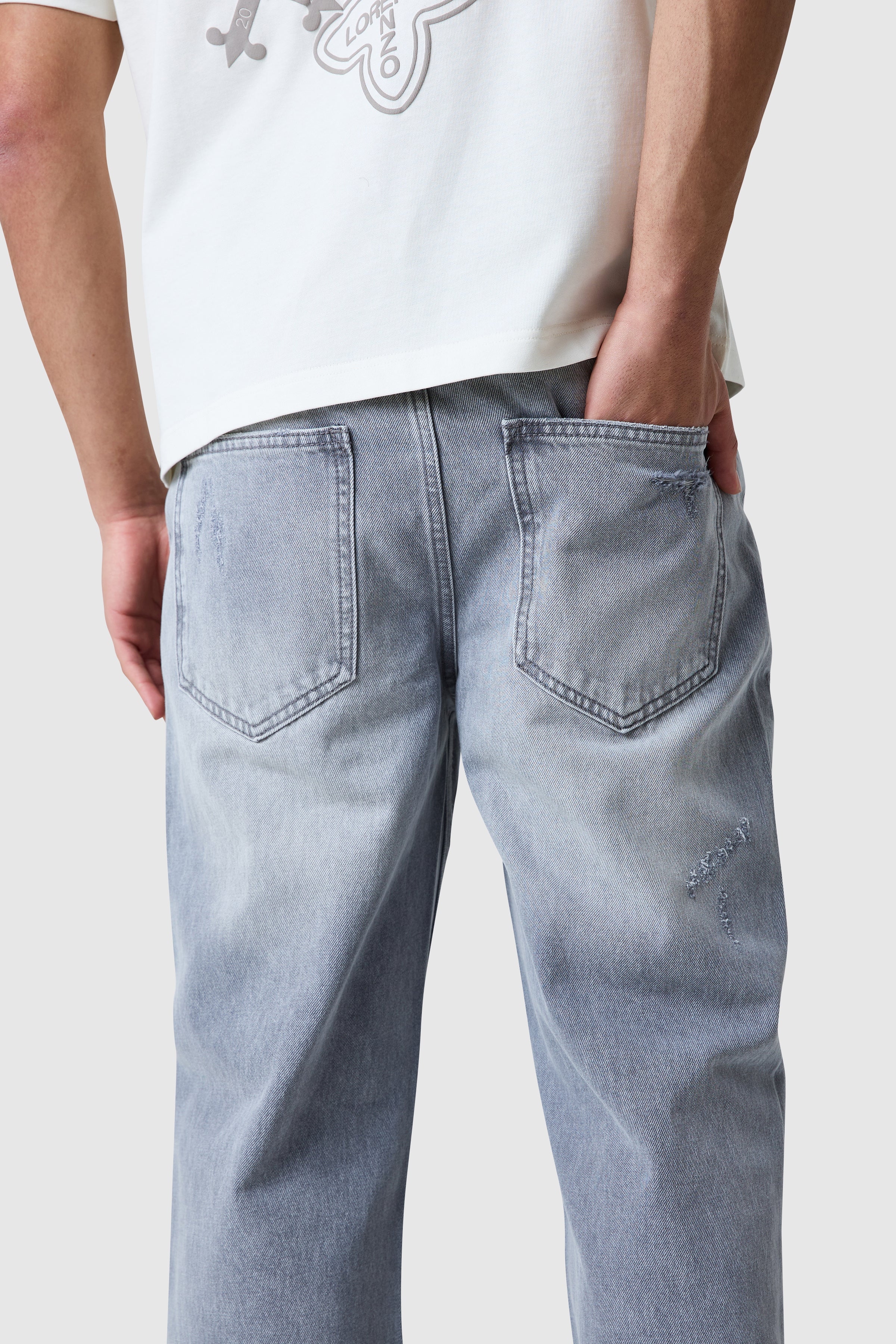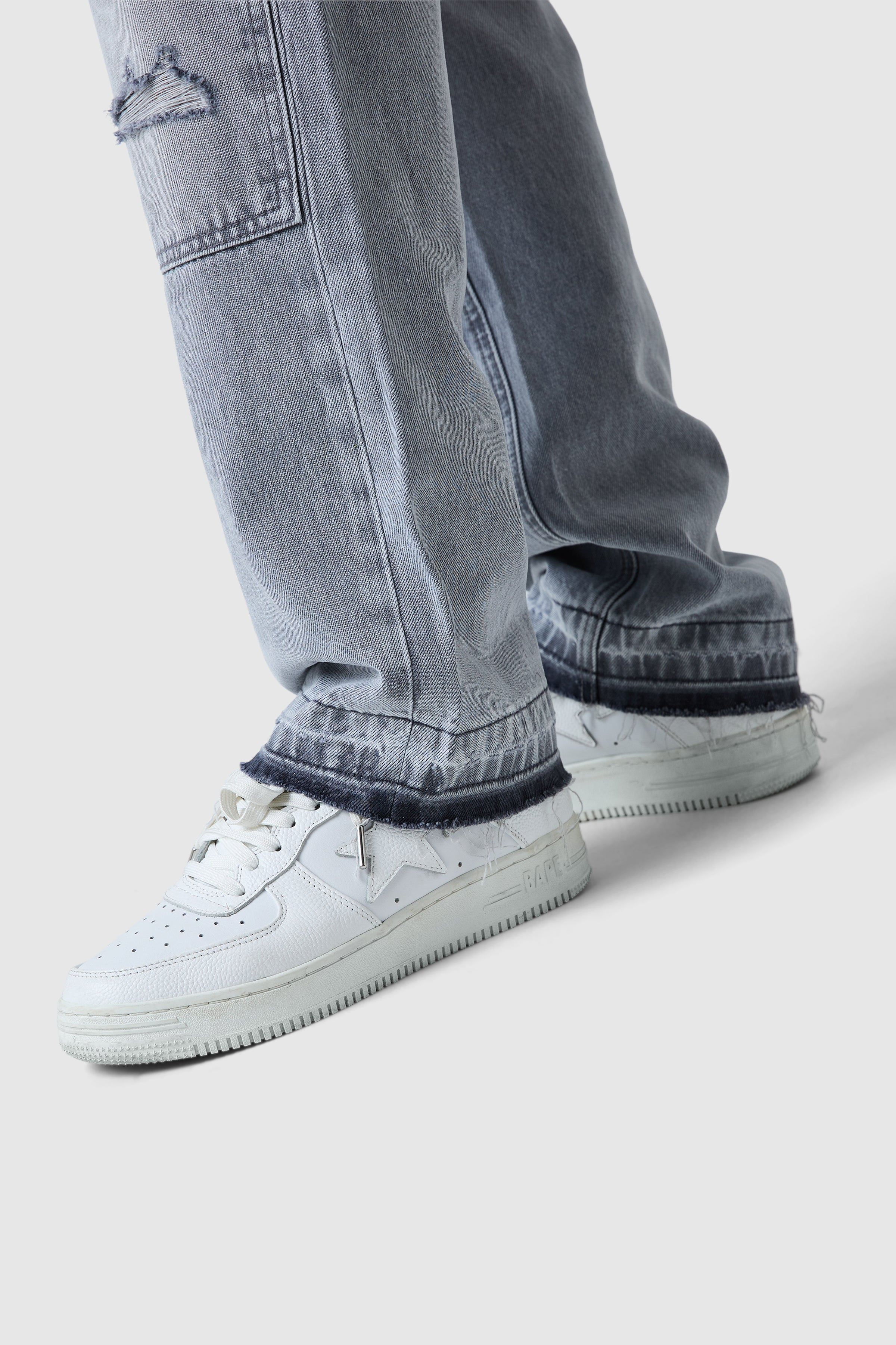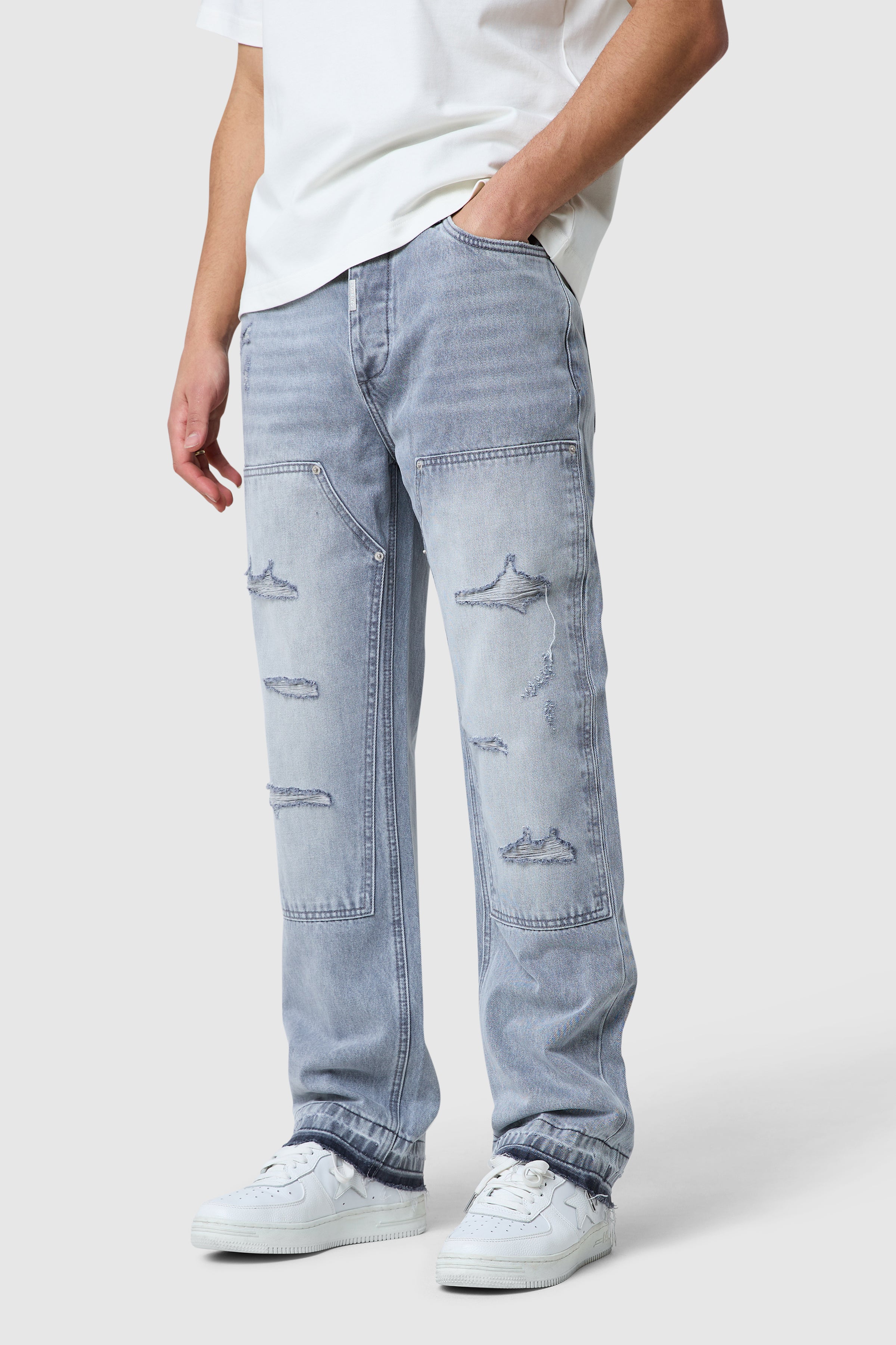 The Xavier Jean features a rigid base for structure, finished with an open hem and raw edge detailing. Distressed elements, including rips, repairs, and abrasions, give each pair a unique, lived-in appearance, complemented by a leather badge at the back waistband.